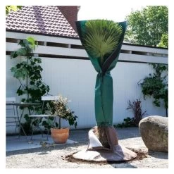 Scherm jouw palmboom af tegen vorst, koude wind en sneeuw met deze beschermhoes. De groene ademende hoes dekt zowel de stam als de bladeren af van de palmboom. Dankzij de praktische veters kan je de de hoes eenvoudig en stevig rond de boom vastbinden.