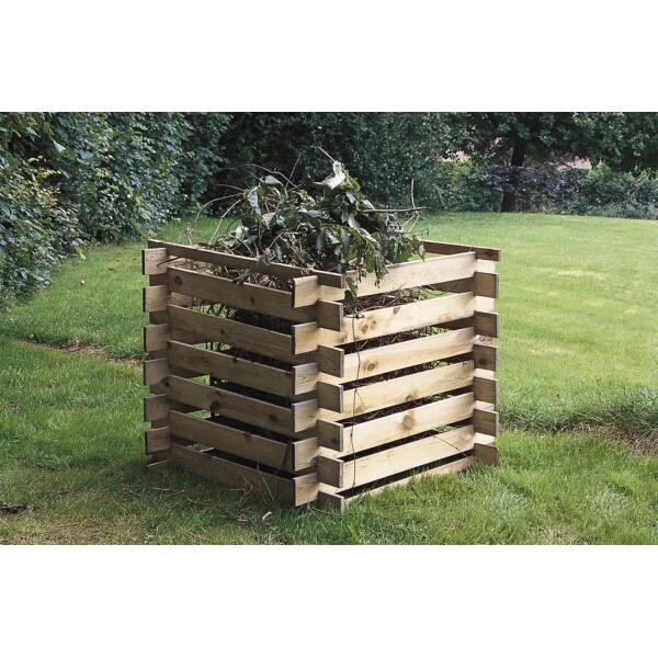 Compostbak in grenenhout voor het verwerken van tuin- en keukenafval.