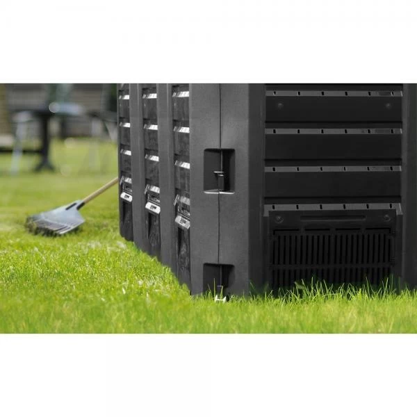 Door de aan elkaar gekoppelde compostvaten heb je eenvoudig de verschillende fases van het composteren in de hand. Zo hoef je niet alle compost tegelijkertijd te oogsten.