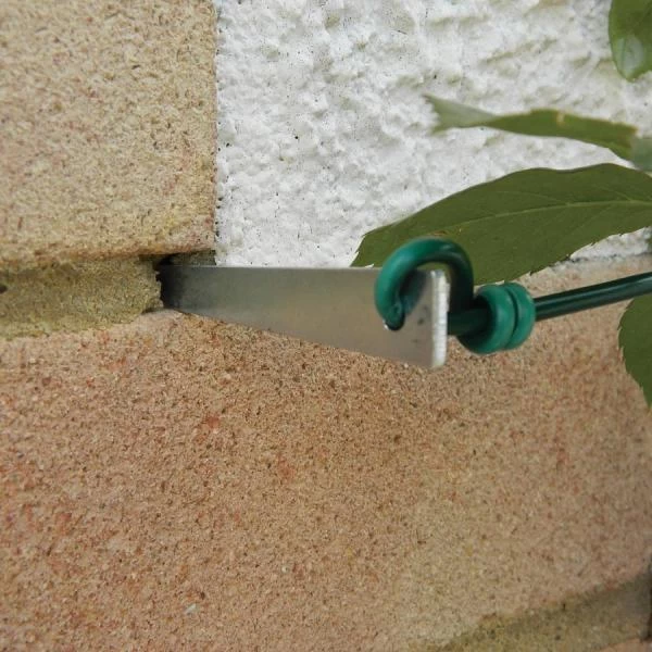 Deze handige geleiders kunnen in de voegen van een stenen muur of in houten palen worden aangebracht. Door het voorziene oogje kan de draad worden gespannen en vastgeknoopt.