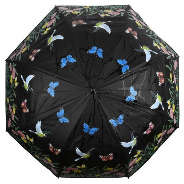 Met deze paraplu kan je alleen maar hopen dat het snel gaat regenen. Eens de paraplu nat wordt, verandert de witte print in een kleurrijke bloemenweide waar de vlinders en vogels vrolijk in rond fladderen.