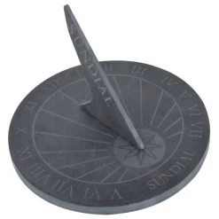 Decoratieve zonnewijzer in leisteen, een fraai en tijdloos natuurproduct. De zonnewijzer geeft de zonnetijd aan, ofwel de echte plaatselijke tijd. Per lengtegraad verschilt de tijd ongeveer 4 minuten. Door de elliptische baan van de aarde rond de zon, vraagt elke zonnewijzer een maandelijks correctie om steeds het juiste uur aan te blijven duiden.