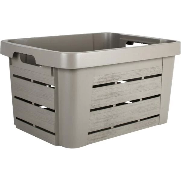 Is afgewerkt uit kunststof met een houtstructuur. Meerdere boxen passen makkelijk op elkaar, waardoor ze snel te stapelen zijn.