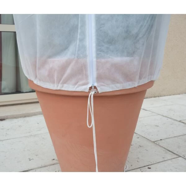 Een set vorsthoezen van Nortene voorzien van een ritssluiting en een trekkoord om makkelijk rond potplanten te kunnen aanbrengen. Vliesdoek is steeds lucht-, licht- en waterdoorlatend zodat de planten geen hinder ondervinden van de afscherming. Binnenin wordt de warmte vast gehouden waardoor een microklimaat ontstaat. Op die manier zijn de planten beschermd tegen vorst, sneeuw en koude wind.