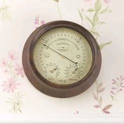 Op de grote wijzerplaat van deze barometer wordt de juiste luchtdruk weergegeven terwijl twee kleinere wijzerplaten de vochtigheid en de temperatuur weergeven. De temperatuur kan je aflezen in graden Celsius alsook in Fahrenheit.